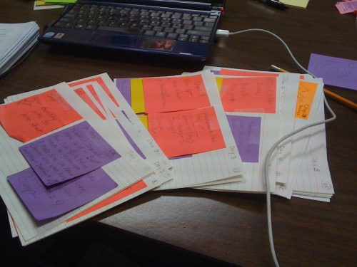 We got out a slew of colored stickies and started weaving, cutting, and listing scene need. We moved things around. Dug deeper. A few scenes to write but mostly tweaking here and there and some cutting. I am psyched. I finally see the book I wanted to write. I can do this.